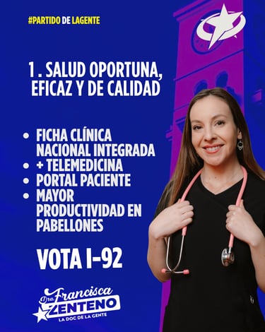 - Utilizaremos la tecnología Implementando un sistema digital único (Ficha Clínica Nacional) de registro y gestión coordinando atenciones, derivaciones y recursos en tiempo real entre hospitales y clínicas a nivel nacional. A su vez, Restructurar y establecer la obligatoriedad de la implementación y el uso de la Telemedicina en todos los establecimientos de salud del país. Por último, propondremos un Portal paciente (robusto) que entre otras cosas permitirá a cada paciente acceder a una ficha clínica en todo momento, fortaleciendo su derecho a la información y continuidad en la atención.