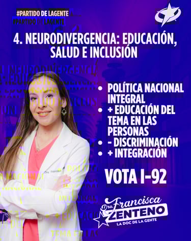 - Creación de una Política Nacional Integral para la Neurodivergencia, que incluya diagnóstico temprano garantizado por Fonasa, formación obligatoria para docentes, y cupos laborales protegidos en el Estado y empresas privadas. Incentivos tributarios para empleadores que contraten personas neurodivergentes.